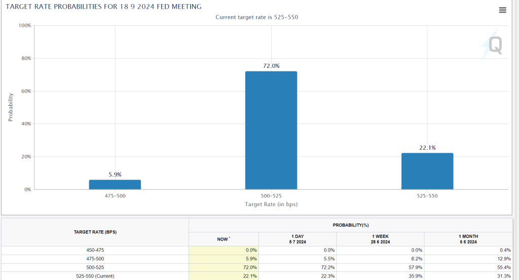 金利トレーダーの織り込み度を見るとこの1週間で大きな変化があった。9/18FOMCの0.25%利下げ織り込みは現在72.0%、1週間前は57.9%。前回のCPI時から米国指標は鈍化傾向なので本格的に利下げも見えてきたが、ポイントは11日[木]CPIでどれだけ鈍化してるか。だが6月の原油価格はずっと上昇傾向でしたのでアナリストの予想数値が低すぎる気がする。これは、、、というシナリオも考えておこう。